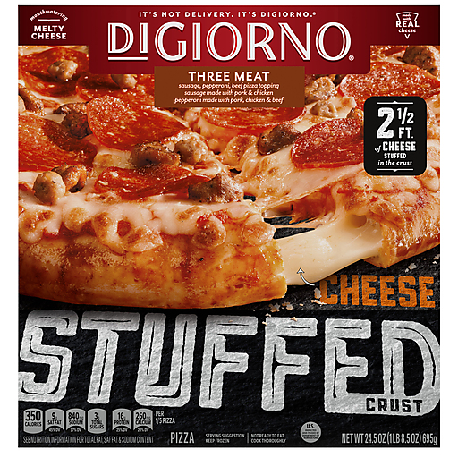 DiGiorno Three Meat Frozen Pizza on a Stuffed Crust is created to bake up golden brown on the outside with 2 1/2 feet of mouthwatering, melty cheese stuffed in the crust. This DiGiorno frozen stuffed crust pizza is topped with sausage, pepperoni, beef and real mozzarella cheese, delivering an easy dinner that's also delicious. The stuffed pizza crust offers a soft and tender inside that is packed with 2 1/2 feet of hot, melty cheese stuffed in the crust. This cook and serve DiGiorno frozen pizza is made with 100% real cheese and DiGiorno signature tomato sauce. Step up your quick family dinners with a frozen three meat pizza from your oven. Keep this DiGiorno stuffed crust pizza frozen until you're ready to enjoy. It's not delivery, it's DiGiorno.